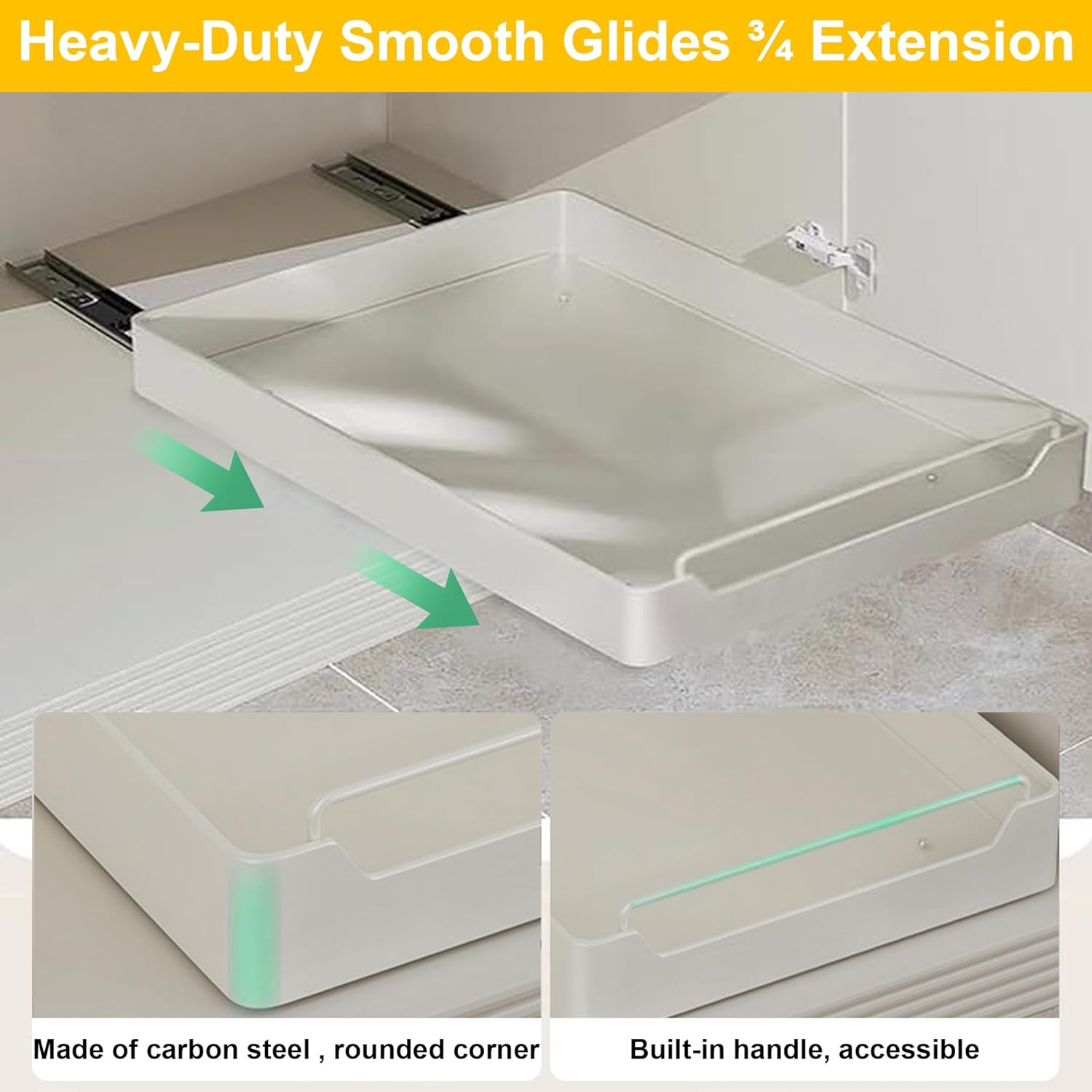 【VERSATILE PURPOSE & SAVES SPACE】These peel and stick drawers are great for tidying up and arranging loose items. They're perfect for your kitchen, bathroom, living room, office, sink, and food storage【SILENT & SMOOTH SLIDING】Tested with 4W opens and closes, these kitchen cabinet shelves slide quietly and effortlessly, even when fully loaded with food. Say goodbye to disorganized, hard-to-reach pantry items! 【NO HASSLE INSTALLATION】With detailed instructions and adhesive backing, it's a breeze to set up these cabinet drawers. Just remove the Nano-film from the glides and attach them to the shelf in 10 seconds. Instantly add convenient storage to your kitchen or bathroom cabinets!