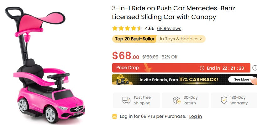 This Mercedes-Benz licensed ride-on car grows with your child from pushing to independent riding. The parent handle gives you control while your little one steers, and safety features like seat belts keep them secure. Built tough for outdoor adventures, it folds down for easy storage and includes a canopy for sun protection. Perfect for developing motor skills while having fun.
