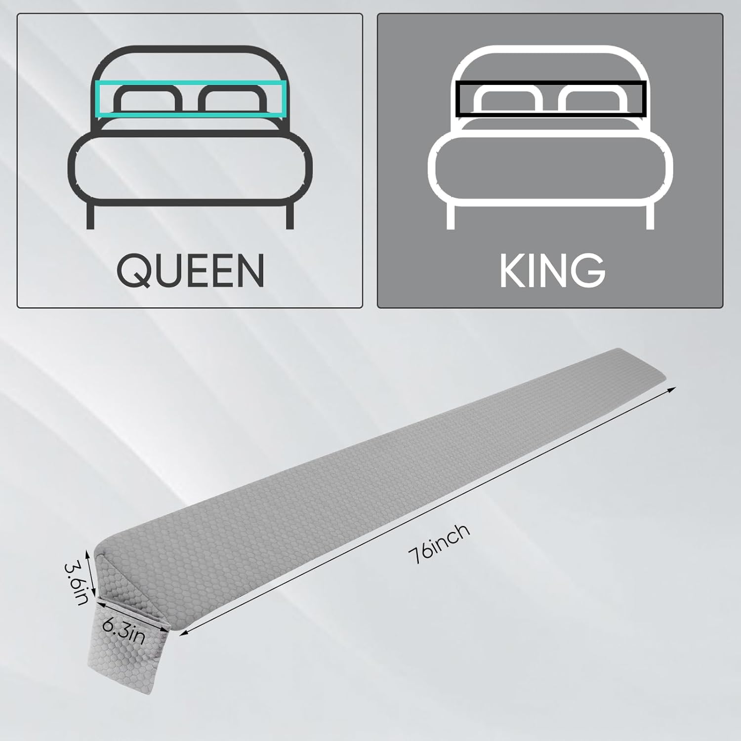 - PERFECT WEDGE PILLOW - If you're struggling with losing items in the bed frame gap behind your pillow, our mattress gap filler is made for you! Our wedge pillow measures Queen:60"x6.3"x6.3" /king:76"x6.3"x6.3". This king size bed gap filler can fill gaps from 0 -7 inches, king size bed wedge pillow can perfectly fill the gap between the headboard or wall and mattress, preventing pillows, cell phones, toys, remotes, or other belongings from falling out of bed