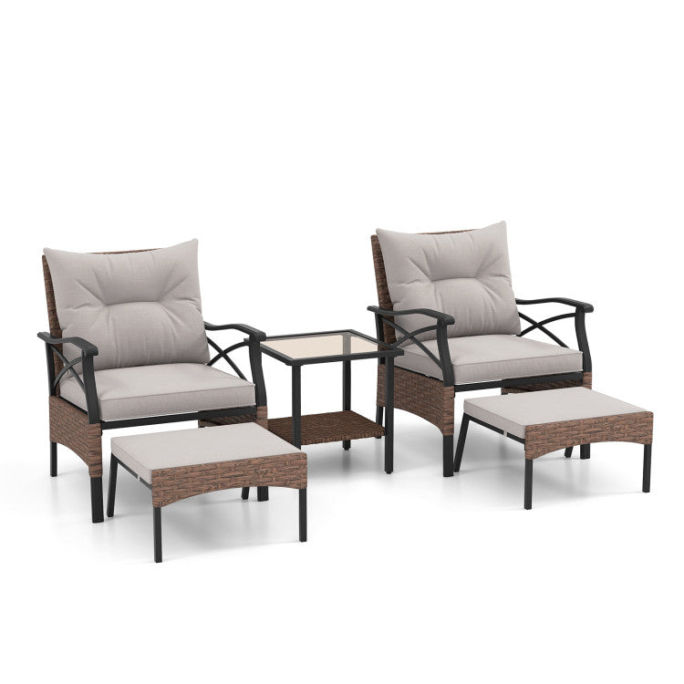 5 Pieces Wicker Patio Furniture Set Ottomans and Cushions and 2-Tier Tempered Glass Side Table