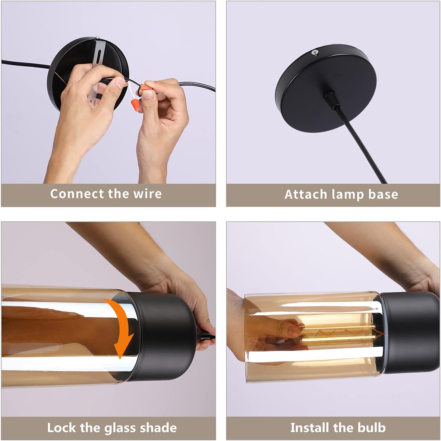Glass Pendant Light, Black Modern Hanging Lamp with Amber Cylinder Shade