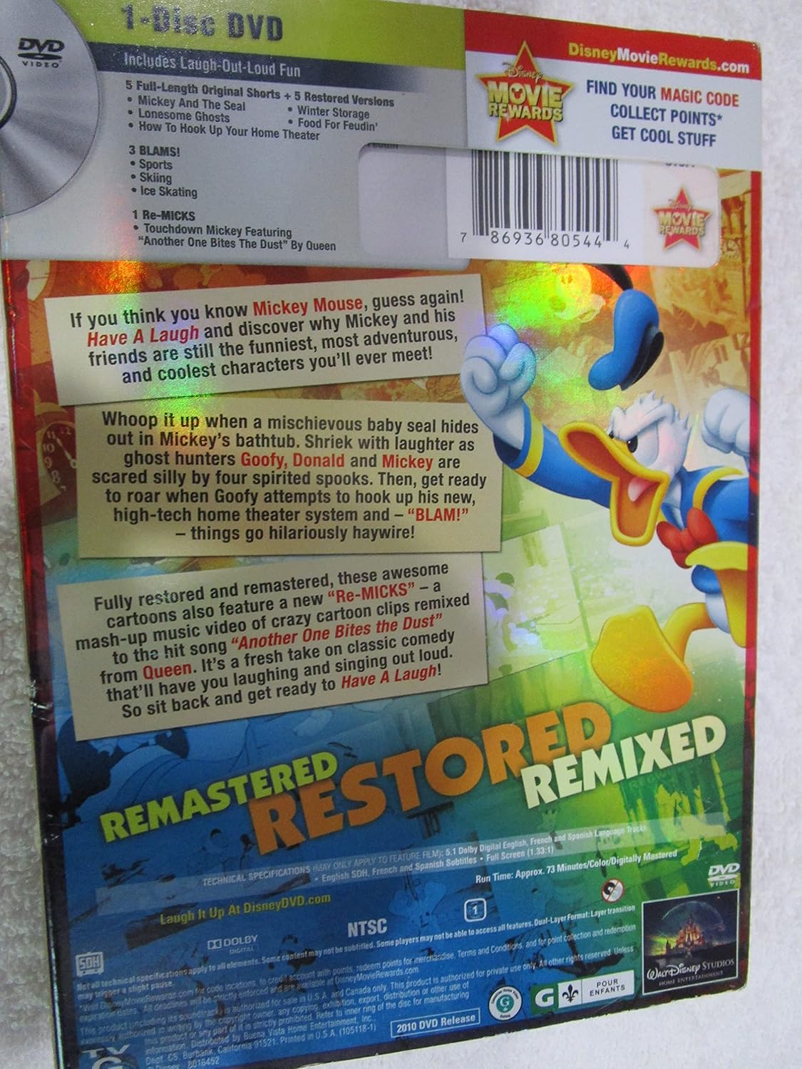 Think you know Mickey Mouse? Think again! Dive into Have A Laugh and see why Mickey and his pals remain the funniest, most daring, and coolest characters around. Laugh out loud as a cheeky baby seal takes refuge in Mickey’s bathtub, then gasp with Goofy, Donald, and Mickey as ghost hunters scared by four lively spirits. Get ready for a wild ride when Goofy’s high-tech home theater setup goes totally bananas! These restored cartoons also include a brand-new "Re-MICKS" music video featuring a remix of classic clips set to Queen’s “Another One Bites the Dust.” Get ready to laugh and sing along!