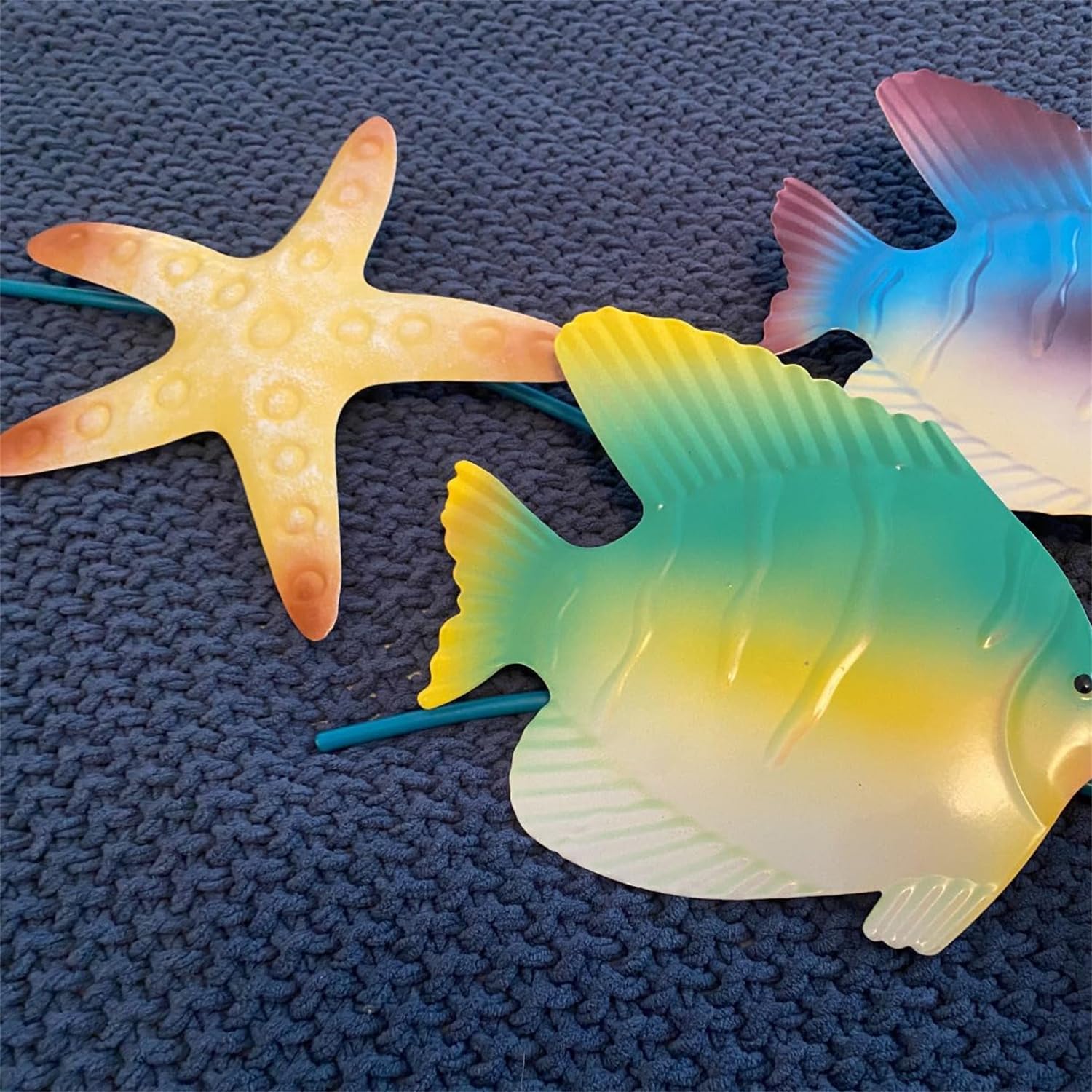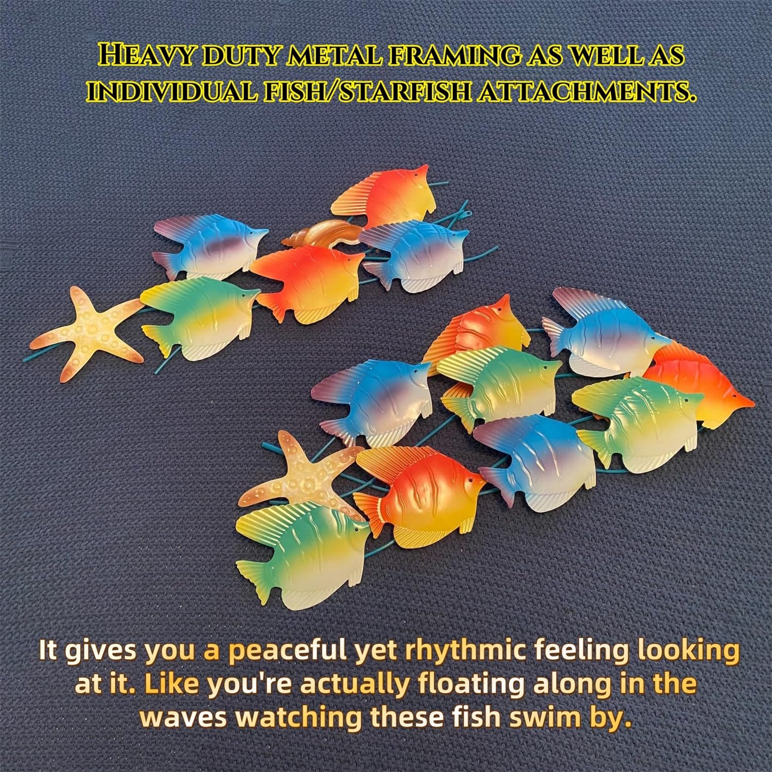 This 3D metal fish wall art measures 59" x 19.6" and features a lively school of 14 colorful fish swimming upward. Crafted from high-quality metal, each fish pops with a realistic 3D effect that adds depth and charm to any space. The smooth, polished surface feels great to the touch and ensures long-lasting durability. Bring a splash of playful underwater magic to your walls with this eye-catching handmade decoration!