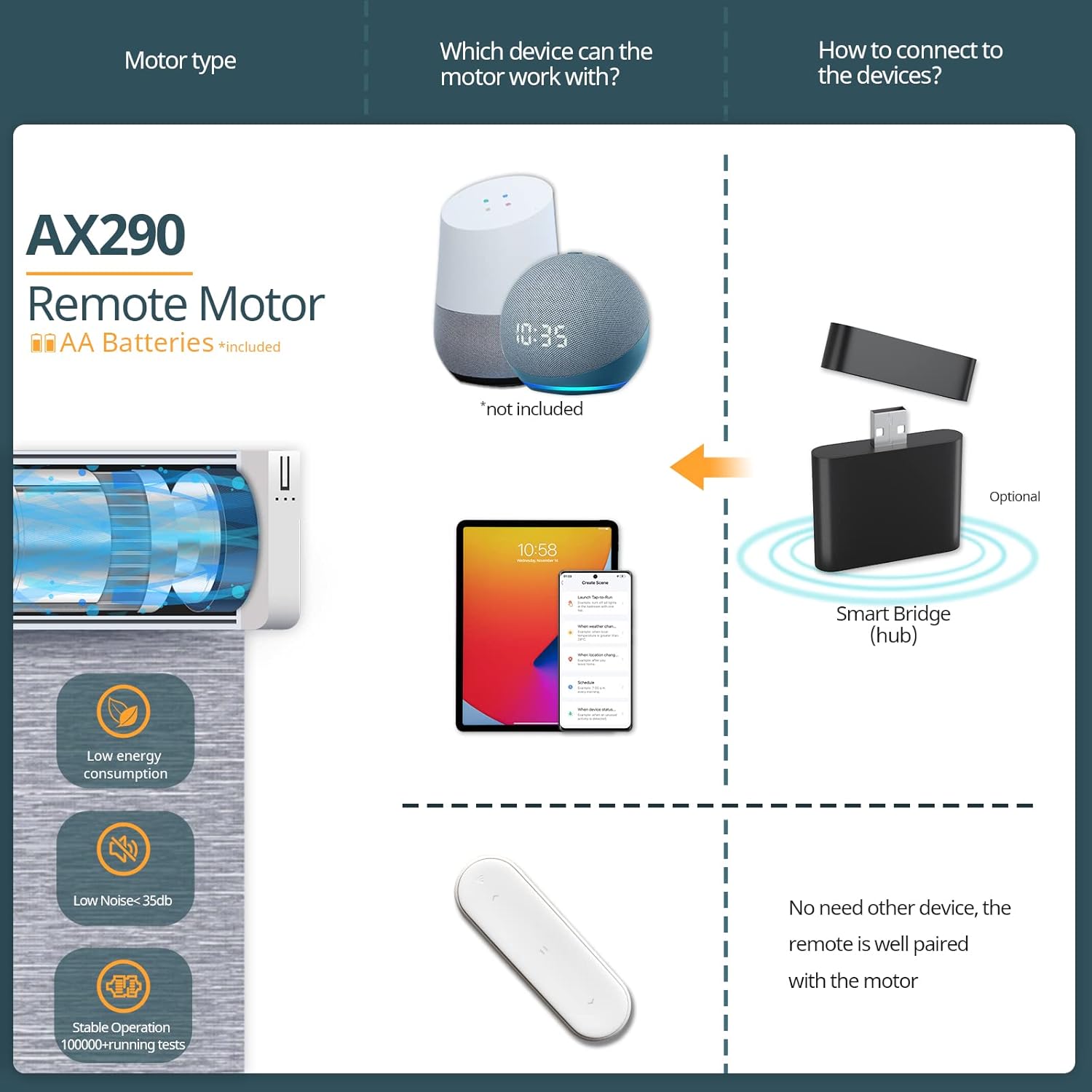 Get ready for hassle-free window magic with these motorized blinds—no drilling needed! Just stick the adhesive block onto the top rail, pop it into your window frame, and you’re all set. Powered by easy-to-replace batteries hidden at the top, these shades come with a sleek valance to block sneaky light peeking through. Crafted from triple-layer blackout fabric, they keep out UV rays and nosy neighbors, perfect for bedrooms, kitchens, or your secret lair. Control them with your voice or app via the AX290 motor and a smart bridge—Alexa or Google Assistant fans, rejoice! Timers and custom scenes make life even cooler.