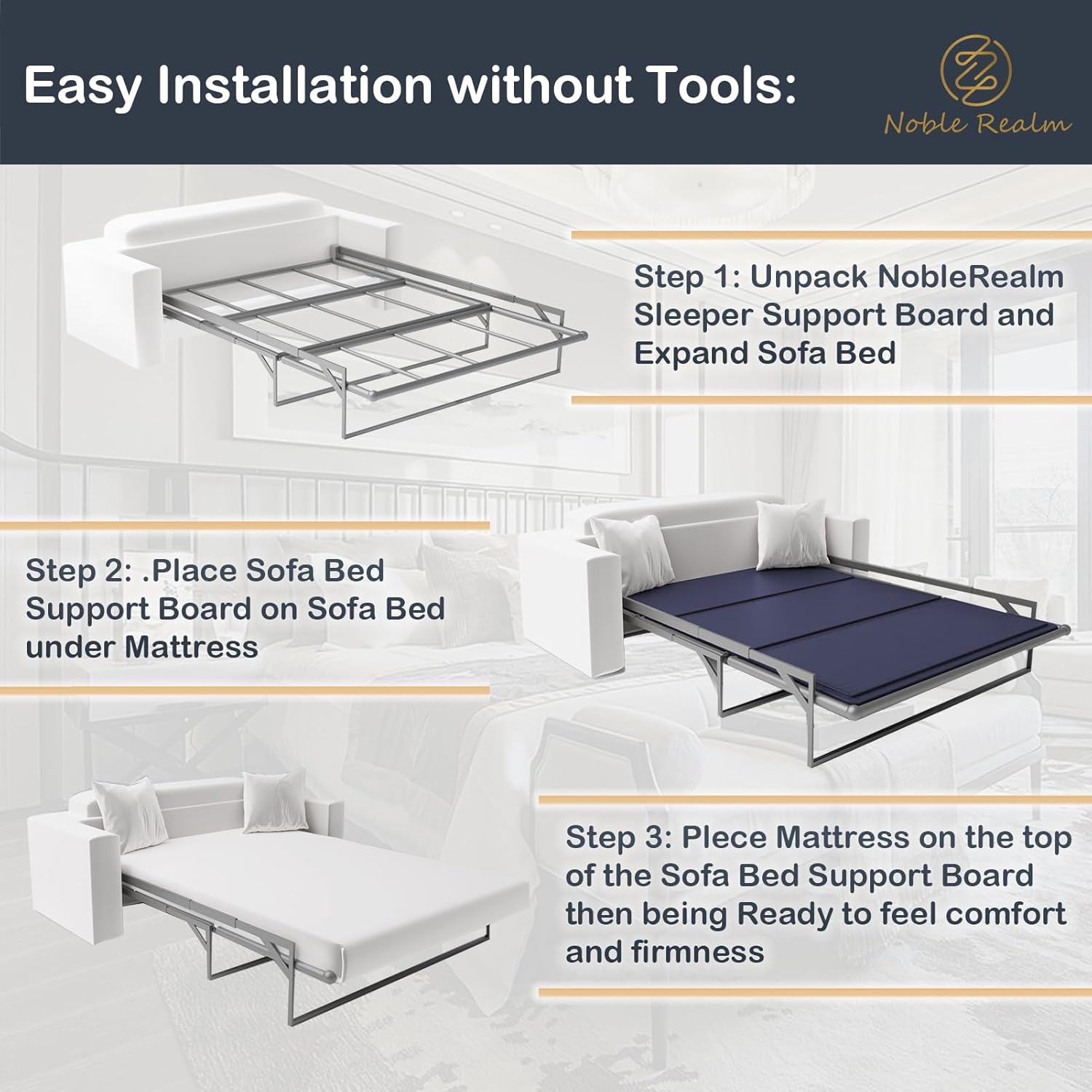 Replace sagging mattress support with the NobleRealm® 6mm Queen Bunkie Board—engineered to eliminate discomfort on pull-out sofas and platform beds. This low-profile support system fits queen-size frames (56.5"x76") and folds compactly to just 48x12x3" for convenient storage. The anti-slip surface with reinforced circular bulges keeps your mattress stable throughout the night, while the machine-washable cover simplifies cleanup. Durable construction delivers reliable support night after night, transforming your sleep quality without the hassle of traditional bed frames.