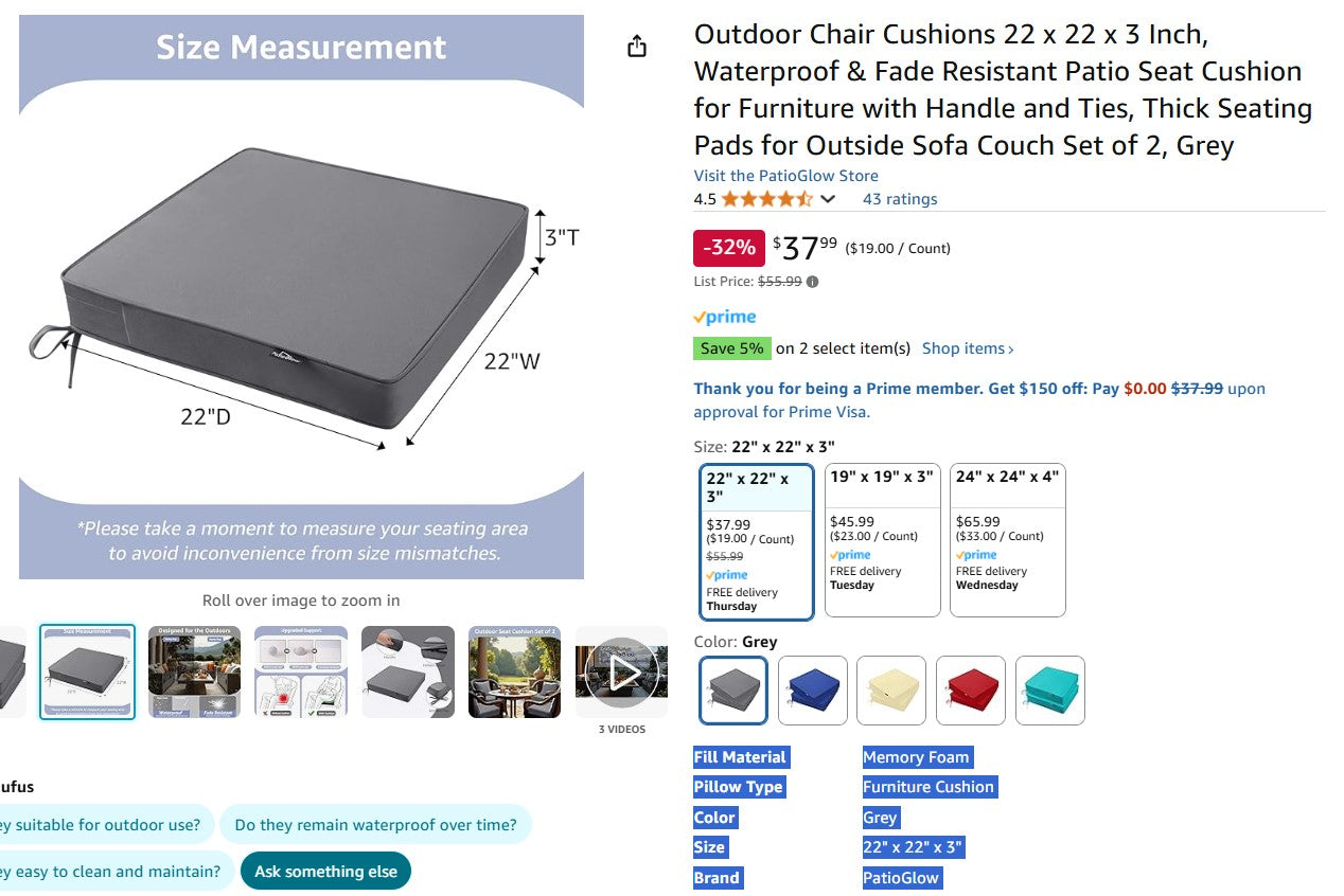 Before you cozy up, double-check your chair size to make sure these cushions fit just right! Each pack comes with two plush outdoor cushions measuring 22” wide by 22” deep and 3” thick—perfect for adding comfort and style. Made with high-density Oxford fabric and fancy fade-resistant dyeing, these cushions stay vibrant no matter the weather. Available in a rainbow of colors, they’re the perfect pop of fun for your patio setup!