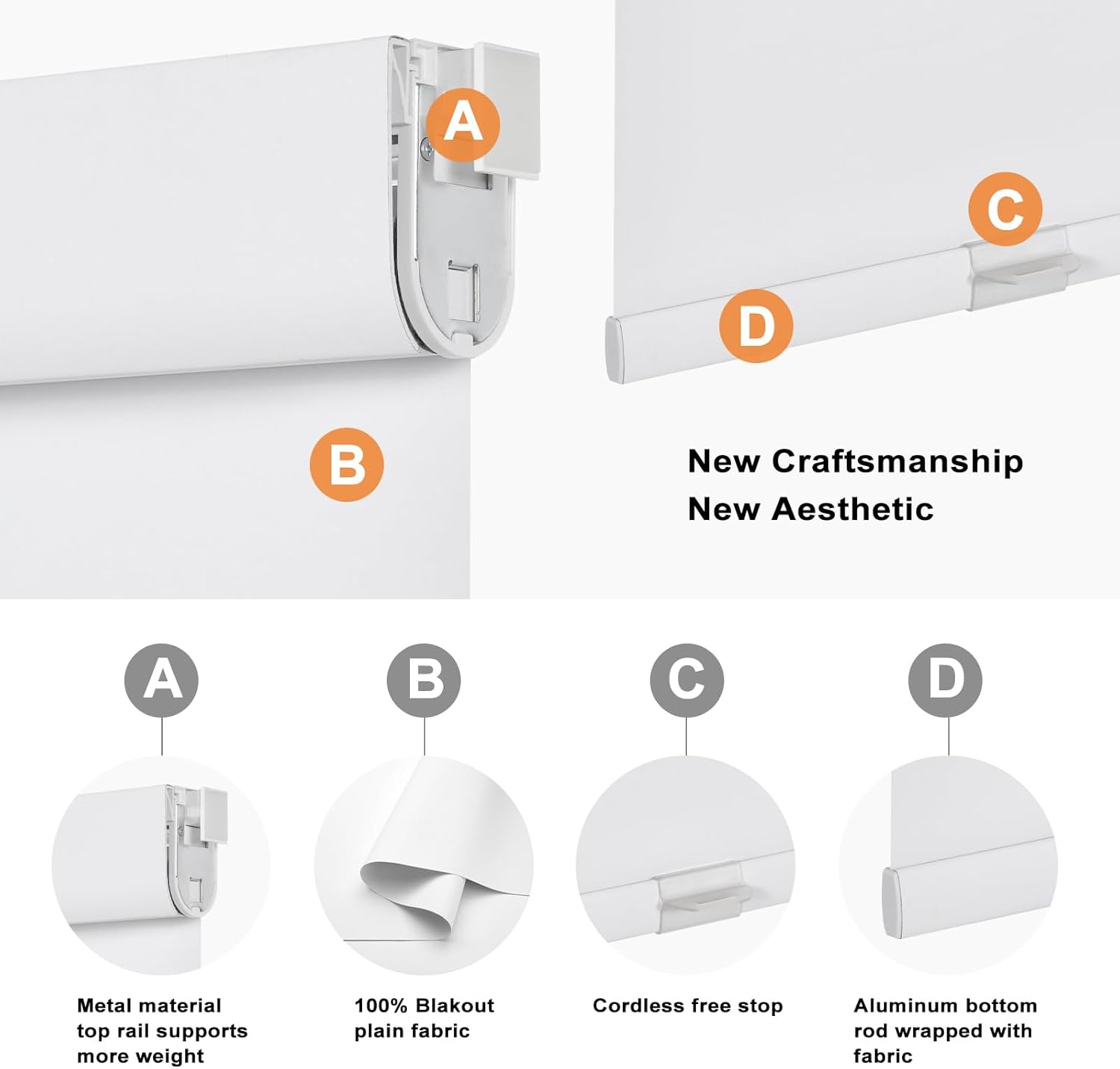 Persilux No Drill No Tools Cordless Roller Shades Blackout Blinds (White, 30" W x 72" H)