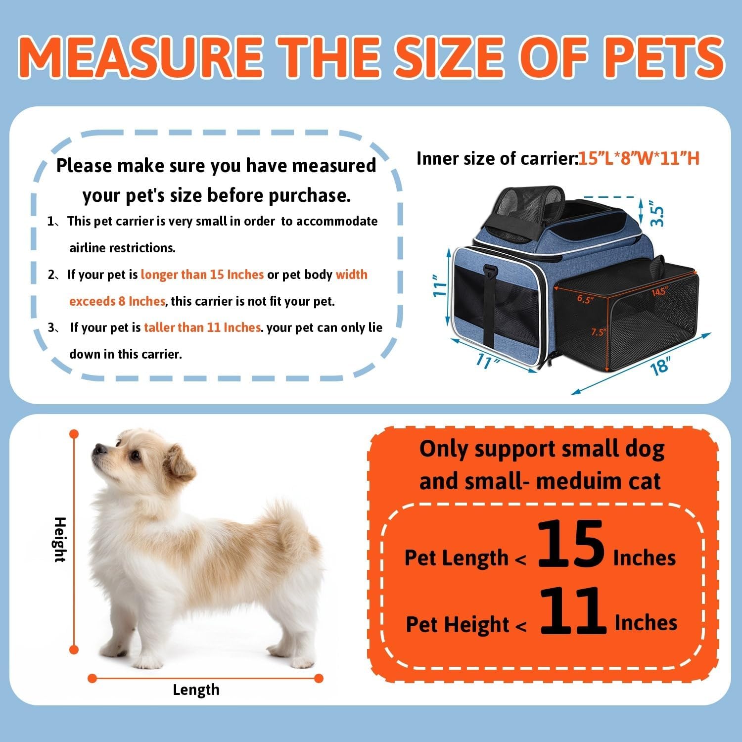 Make sure to measure your furry friend before grabbing this carrier—it’s perfect for small dogs and cats fitting within 15"L x 8"W x 11"H inside. Ideal for pups under 10 lbs and kitties under 12 lbs! This expandable Petskd carrier (18"L x 17.5"W x 14.5"H when unfolded) is TSA-approved and fits snugly under the seat on Delta, United, and American Airlines flights. With mesh panels on five sides, your pet can enjoy fresh air and a great view, while you keep an eye on them through three secure openings with double zippers. Travel time just got a whole lot cozier!