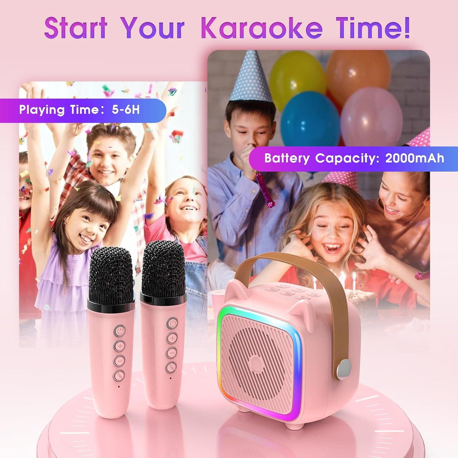 - Experience crystal-clear sound with the perfect karaoke machine for little girls! Designed for ages 3 and up, this mini portable karaoke set includes two wireless microphones and advanced audio technology for hours of joyful singing. Connect via Bluetooth or use the TF card loaded with 20 fun kids' songs, ideal for young music lovers. With up to 6 hours of continuous playtime, it’s the ultimate gift for birthdays, family fun, and parties that keep the music going strong!